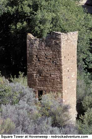Square Tower Group is spread along the sides of Ruin Canyon, a Y-shaped tributary of McElmo Creek. Thirty kivas were scattered along the slopes between stone masonry housing units; as many as 500 people lived here. Hovenweep Castle is what remains of a large pueblo that stood along the canyon rim. The eponymous Square Tower is a three-story high spire built on the sandstone bedrock below Hovenweep Castle. Its location near the spring at the head of canyon suggests it was some kind of ceremonial structure. (N 37.385694, W -109.075526) Hovenweep House is a horseshoe-shaped building located near the remains of a check dam on the rim above the spring. Check dams held water and allowed for percolation through the soft sandstone to an impervious layer of shale beneath; the concentrated flow was shunted over the shale into a sheltered alcove. Tower Point, at the center of the Y of the canyon, holds a single round tower that offers a commanding view of the surrounding area. The canyon below it was filled with dwellings that made up a pueblo-like structure. Across from Tower Point is Eroded Boulder House, a dwelling built entirely within a large boulder. Above that, on the canyon rim, are the Twin Towers, a pair of two-story apartment-type buildings containing 16 rooms. Across and down the canyon are Stronghold House and Stronghold Tower, which were once connected by a log that bridged a crevice in canyon. Beyond Stronghold House is Unit-Type House, a dwelling similar to unit pueblos of Mesa Verde. Openings on the east wall of Unit-Type House were arranged to allow a determination of solstices, equinoxes - perhaps even moon cycles.