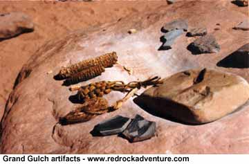 The Perfect Kiva alcove shelters all kinds of artifacts. Thats one of the reasons I find it fascinating. Many ruins throughout the southwest have been stripped everything that can be looted has been hauled away. Perfect Kiva is a wilderness museum with exhibits intact. The last time I was there I saw dozens of pottery shards (some with very impressive designs), ancient corncobs, braded reeds and a very large grindstone (metate). The metate rock has "stations" where several workers could use manos (the smaller stones used to crush grain against the metate) simultaneously. (Perhaps an early assembly line?) Copyright Dave Webb, 2005 |