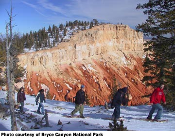 Winter is perhaps the most beautiful time at Bryce, when snow caps the pink hoodoos making them more colorful than during any other season. Photographers find the scenery breathtaking and give their cameras workouts, shooting one picture after another. Every Presidents Day weekend Rubys Inn hosts the Bryce Canyon Winter Festival. This year it will be held February 18-20 (2006). The three-day event includes cross country ski races, a people-powered sled race, kids snowboot races, an archery clinic, archery biathlon competition, free snowshoe tours, free clinics in photography and snow sculpture, kids' events, food, music and much more. Most of the clinics and events are free but there is an entry fee for some activities.
