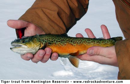 Scofield Reservoir is usually our first major fishery to freeze; the ice there will probably be thick enough to safely support ice fishermen in early December. Birch Creek and Woodruff reservoirs, over near Evanston, and Currant Creek Reservoir will probably also have safe ice about that same time. It's hard to predict the timing for ice-up and it is always essential for fishermen to use caution when ice fishing. Stormy weather can slows down the freeze. If we get several clear, cold nights, most of our waters could be frozen solid within a few weeks. That said, this year I expect popular local waters like Lost Creek and East Canyon reservoirs to be ready for ice fishing by mid December. Anglers look forward to ice fishing on Strawberry Reservoir, which will probably be safe to fish by Christmas. Causey, an excellent small, deep reservoir above Ogden, will probably have safe ice about that same time. Rockport has offered great ice fishing in recent years and it should be safe by Christmas. Panguitch Lake is one of our better waters in southern Utah and it should also be safe by Christmas. Fish Lake should be solid and offer very good fishing by New Years Day. Bear Lake sometimes freezes and sometimes doesn't. My crystal ball says it will have ice by mid-January, in time for the cisco run. Some of the bays at Flaming Gorge Reservoir should also support ice fishing by mid-January. Ice fishing is often very good during the first couple weeks after a water freezes. For that reason some people rush to be the first to get on the ice, even to the point of venturing onto thin, dangerous ice. That is crazy. There is plenty of good fishing available and no need to endanger yourself or others. In general, four inches of clear, solid ice is needed to safely support a group of ice fishermen. Use caution when fishing on new ice. Drill a test hole over shallow water near shore. Only move out away from shore when you are positive the ice is safe. Huntington Reservoir, located along the Skyline Drive above Fairview, is popular because it freezes early, and because tiger trout are fun to catch through the ice. Tigers are a cross a between a brown trout and brook trout. They are an aggressive fish and readily bite jigs tipped with bait. They are beautiful, as you can see from the photo that accompanies this article. Most of the tiger trout caught in Utah are small but occasionally a tiger over 20 inches long is pulled through the ice at one of our reservoirs. Copyright Dave Webb, 2005 |