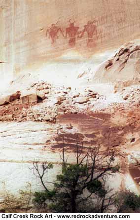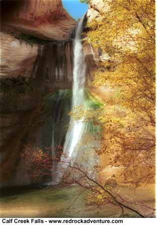 Day after day the sweet water boils out of the rock above the Upper Falls and begins its tortuous run to the Escalante River. Along the way it sculpts and polishes the bedrock, carving the sandstone grain by grain, relentless in its flow. Thus the canyon is in a constant state of flux, changing, albeit invisibly, right before your very eyes. That's part of the magic of this country. Like a beach pounded by individual and unique ocean waves, its beauty and function are constant, yet its face is ever changing. Calf Creek is located a few miles southwest of the town of Boulder and is so named because pioneer stockmen used the drainage as a natural stock pen where calves were weaned. It forms two boxes, an upper and a lower, divided by the silvery braids of Lower Calf Creek Falls. Both are located within Grand Staircase Escalante National Monument. The hike to the Lower Falls is one of the most beautiful, and popular, in Southern Utah. Starting at a BLM campground and picnic area, the sandy, self-guided nature trail follows the stream past petroglyphs and Indian ruins to the waterfall and its deep-blue pool. Surrounding the pool are vibrant hanging gardens and luxurious growths of moss, ferns, watercress, columbine, sedges, and monkeyflower. Less well known yet equally beautiful is the Upper Falls. It is a smaller version of the Lower Falls, with an 86-foot ribbon of water falling into a shimmering plunge-pool. Fluorescent green moss carpets the wall behind the falls, and hanging gardens thrive in the misty air. Above the falls are deep water-pockets that make for an exhilarating swim, while the plunge-pool of the falls itself is cold and clean, the perfect place to wash away accumulated sorrows.