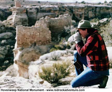 Winter is a great time to visit this area. It is high desert country and nights can be bone-chilling cold. But most winter days are sunny, with mild temperatures and conditions favorable for hiking and exploring. In ancient times, life at Hovenweep was simple, yet elegant. In these shallow canyons on the Cajon Mesa, they built a culture that beat to the rhythms of the natural cycles that surrounded them: the revolutions of the sun and moon, the harvest, the hunt. Their life has been described as "Eden lost," but it wasn't easy, nor was it as romantic as we sometimes imagine. At the height of summer, the desert sometimes swelters in a 110-degree fever of heat; on a cold night in deepest winter, it can be a frozen hell. Evidence of warfare and cannibalism add a dark twist to our conception of how these people lived. Some wonder how they could have survived here at all: "This guy took one look around and said: 'This is God's Country - and why in God's name would anyone live out here?'" relates Darby Bramble, a park ranger.