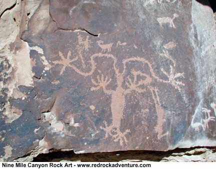 However, I'm glad there are places to see rock art close to the road. It keeps the riff raff away from the wilderness sites. I am a wilderness snob. My reluctance to encourage any of you to search for rock art is overcome by my desire to educate and agitate. We should protect more wilderness, so there is room for all us wilderness snobs to avoid each other. Backpacking means seeing the canyon the way the ancient native Americans saw the canyons; towering sandstone walls, with the juniper trees scattered across the rock. Deep in the canyon one can listen to the canyon wrens that inspired Kokopellis flute, drink from the same stream, and walk the same paths as they did. How else can one appreciate their lives and what they left behind. These people grew crops, built multi-story buildings, made baskets, pottery, and created a culture in a place with little rain and wild temperature extremes, even snow. To begin understanding one must sit alone in the ruins surrounded by pottery shards, corncobs, turkey feathers, bits of twine, flints and rock art. Finding rock art means trying to think like the Anasazi, the Fremont, the Sinagua, the Hohokom and all the others. The search keeps me focused on the canyon. My theory is that they picked places with the best views (lookouts for seeing the enemy). It is not foolproof. Just when I think I have it figured out, I climb up to a place, sure that there will be rock art, but there's none. The anticipation is great, the disappointment is real. Then again, if I found some every time there would be no mystery, no appreciation, no reason to explore, or think. The trick is to try as many potential sites as possible. One has to be willing to suffer through the tamarisk, the hackberry, and the willow that protect the images. The scratches are good souvenirs. Be careful of the cryptogenic soil, we need that black crust to protect the canyons. I have learned to resist the urge to take that one shard of pottery that no one will miss. It is always disappointing that no matter how remote the site, someone has come before and stolen artifacts. More is missing than just a pot or an arrowhead. The piece belongs to the place. It does more for the canyon than it would do for me or you. Instead I draw, write, photograph, sit and stare. I soak the place into my skin. Someday I'll find an undisturbed, unseen rock art site. Searching for rock art reminds me there are more questions than answers. What do they mean? How did they get them so high up? Who made them? Why did they make them? How many more were there? Were they made at the same time? How did they decide where to put them? Who were they drawn for? Was it a language, a religion, messages, or just doodling? In the canyons, the age of the earth becomes clearer. Viewing a corn cob takes me back hundreds of years. Their voices are still there. Looking at streaks carved in the cliffs takes me back through millions of years of wind and water. I realize when my time human time ends, the canyon will not. The Anasazi did not imagine us, we cannot imagine what will come after us. We are not at the end of time, we are in the middle perhaps even the beginning. We are witness to a split second in the canyons life, frozen in rock, for now but not forever. I sit at a panel of bighorn sheep and look out over a canyon. In the canyon's life span I just missed meeting my ancient friend. We share the view of a canyon. It is up to us to ensure that the view remains. The creators of the rock art left behind a legacy. Our legacy should be a canyon protected as a wilderness. Copyright Dave Webb, 2005 |
