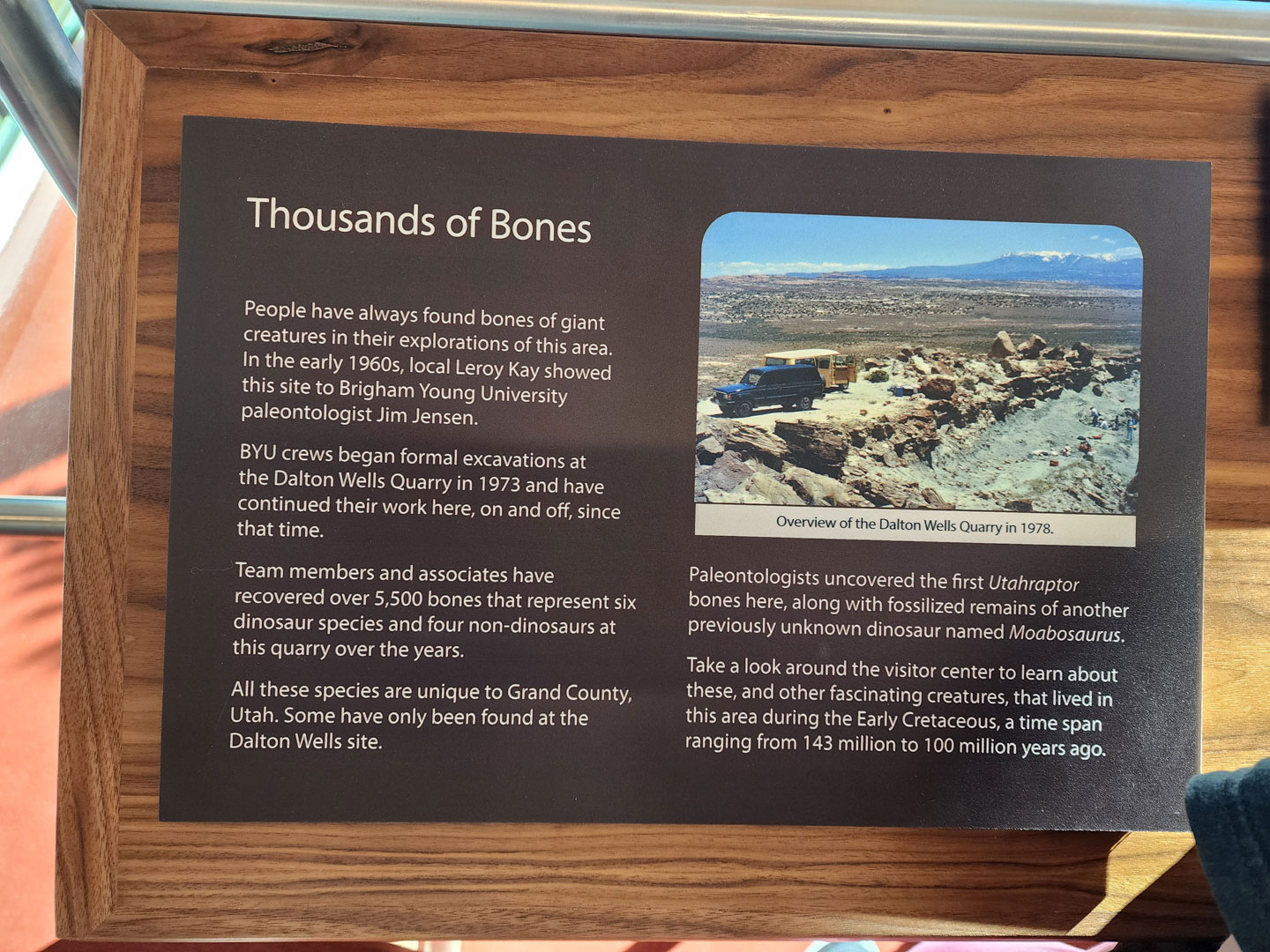 We know that there are many places near Moab where you can see dinosaur tracks, and that fossils have been found nearby. But we had no idea of the importance of the Dalton Wells Quarry. The quarry is no longer active, and there is not much for visitors to see at the site, but its history is fascinating.