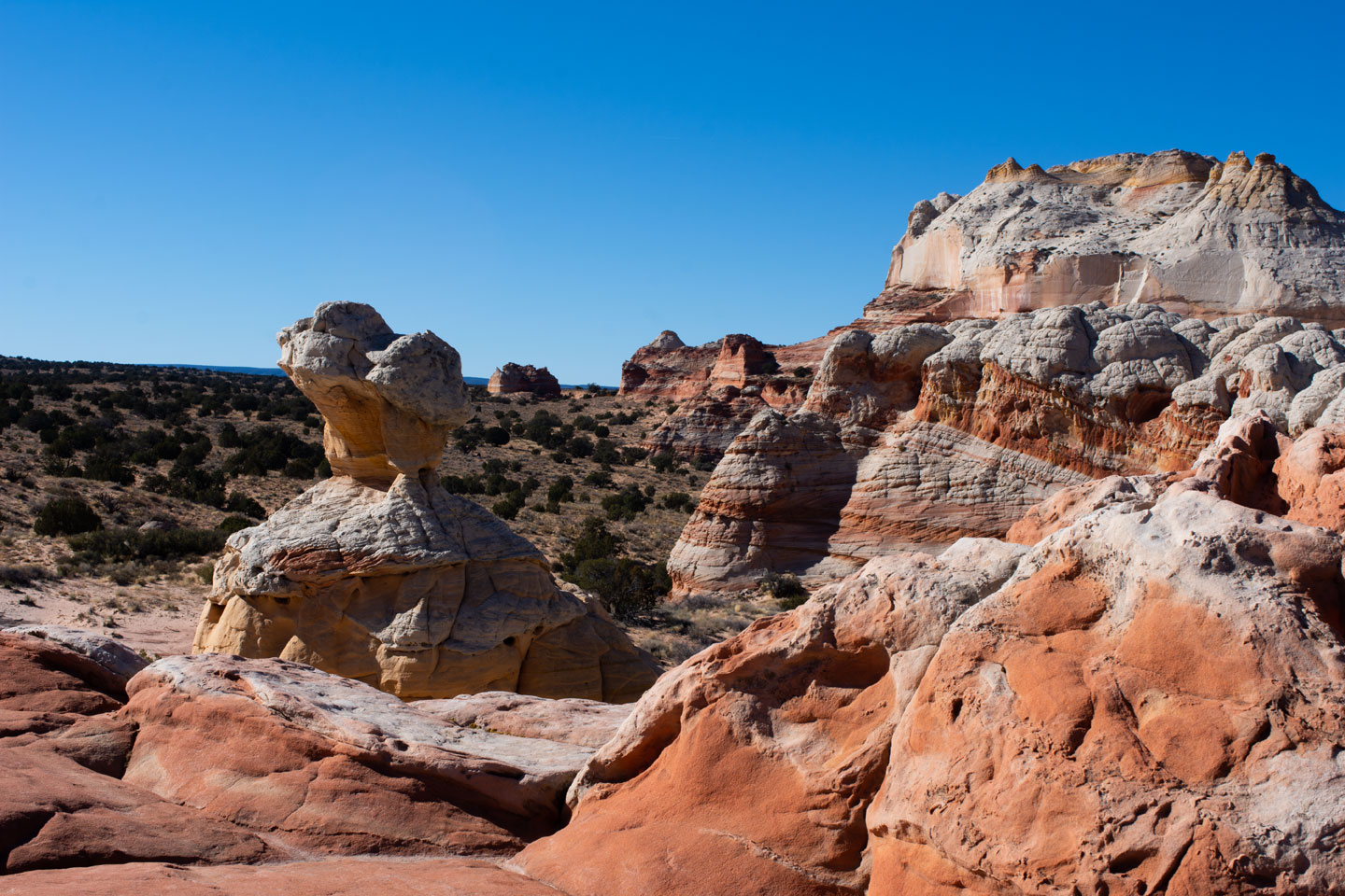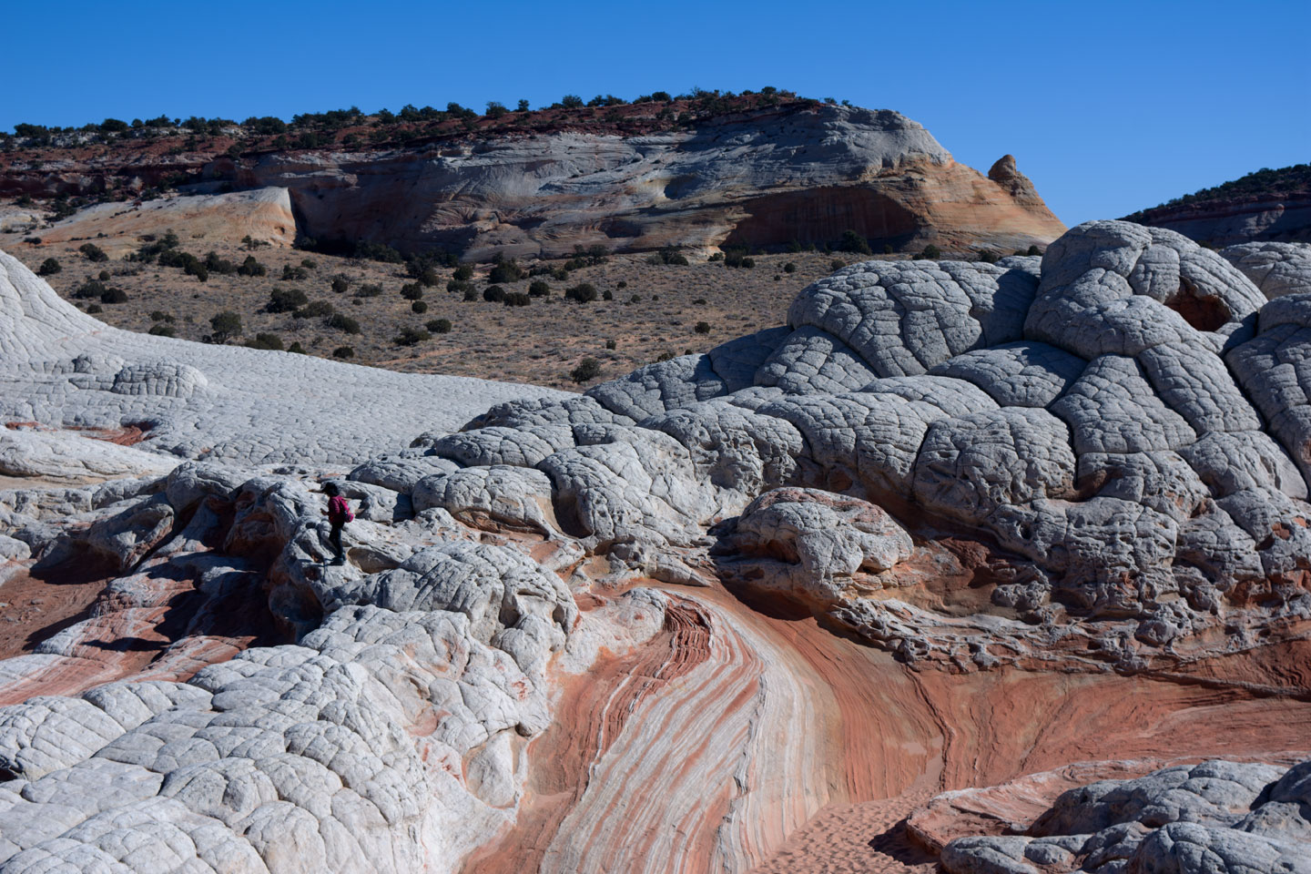 It is also just south of the famous Wave formation. White Pocket contains rock formations similar to those at The Wave, but both areas are distinctly beautiful. The Wave is located in Coyote Buttes North special use area, where permits are required to hike and only a small number of people are allowed to visit each day. Permits and limited visitation rules are also imposed at Coyote Buttes South. White Pocket is just outside these outstanding areas and no permits are required – and there is no limitation on the number of visitors per day.
