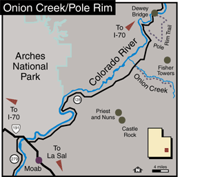 The Onion Creek trail turnoff and campground sites are about 250 miles south and east of Salt Lake City, and some 20 miles east of Moab. If coming from the north, travel about 1.5 miles beyond the Arches National Park entrance along U-191, cross the Colorado River bridge, then turn left (east) onto U-128 for about 20 miles. A brown sign on the south side of the highway marks the dirt road entrance into the gulch. The trail is not technically difficult, and most stock clearance off-road vehicles should be able to maneuver without much trouble.