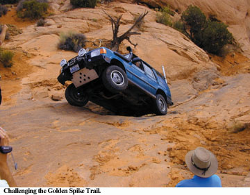 Dan was taking a group of Land Rover Discoveries and their owners from San Diego, Calif., on the Golden Spike Trail, located a few miles northwest of Moab, and I was riding shotgun. The Golden Spike rattles the bones of thousands of visitors each year, and I was next in line.