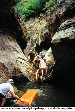 You will need a 50-foot length of rope. One-inch tubular webbing is perfect. It is lightweight and flexible. Tie knots every foot or so for good hand holds. Take wet bags for cameras, plastic trash bags for your daypack. Pack your lunch in a plastic container and duct-tape it shut. Wear swimming gear and tennis shoes or old hiking boots, because you will be in and out of water for the next few miles. You will be tempted to wear only water sandals. Don't. The dry trail and rocks will beat your feet up.