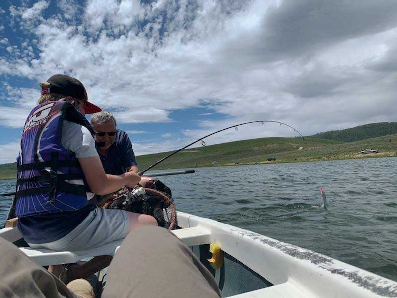 Much of the reservoir is shallow and weedy. The weeds provide great cover for the trout and support insects for the trout to eat, but the weeds also make fishing somewhat difficult. We found it best to use flies or baits/lures that run just under the surface, above the weeds.