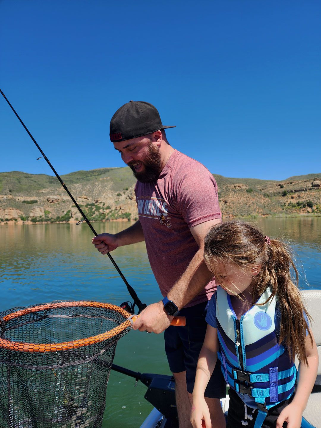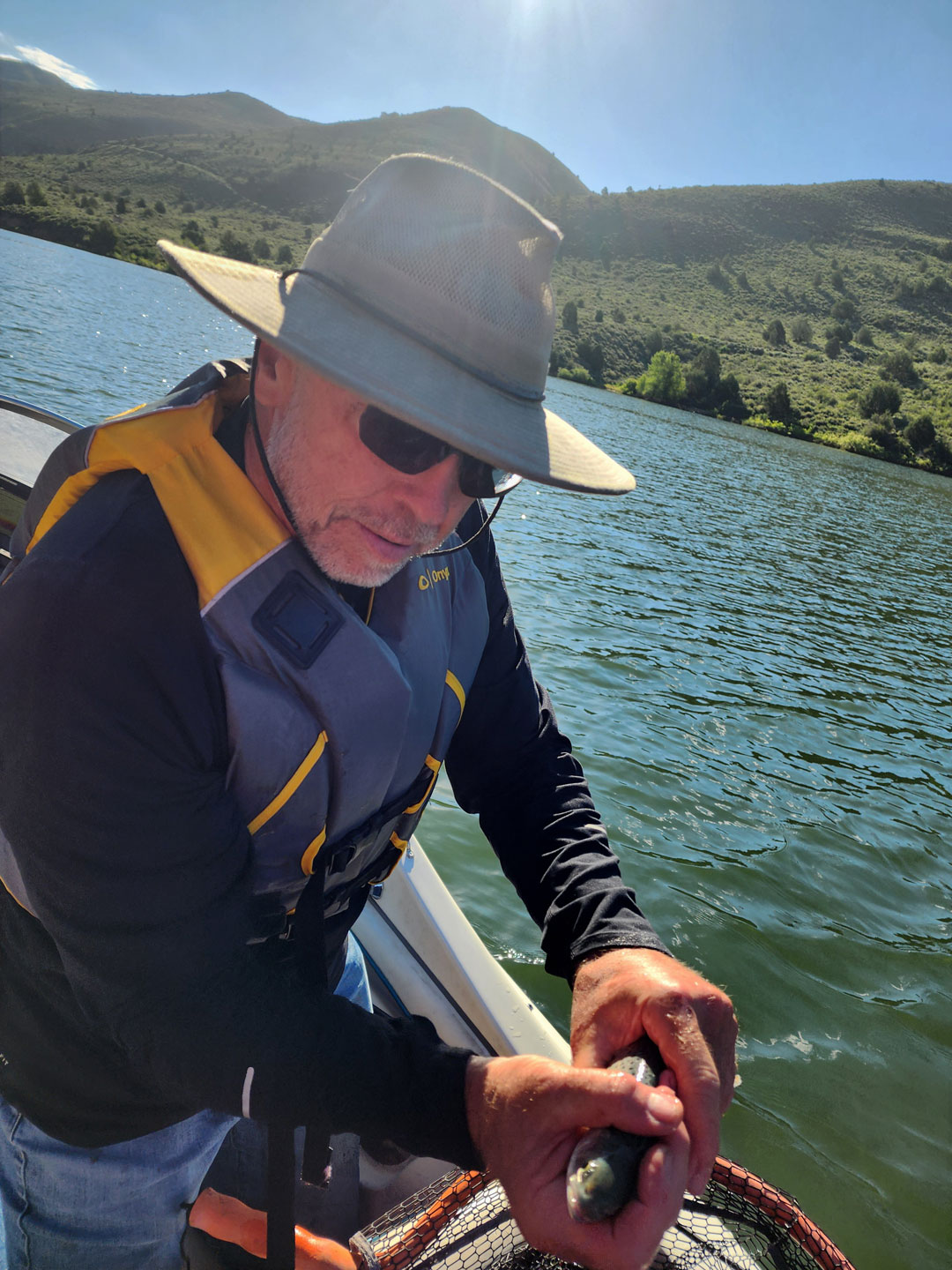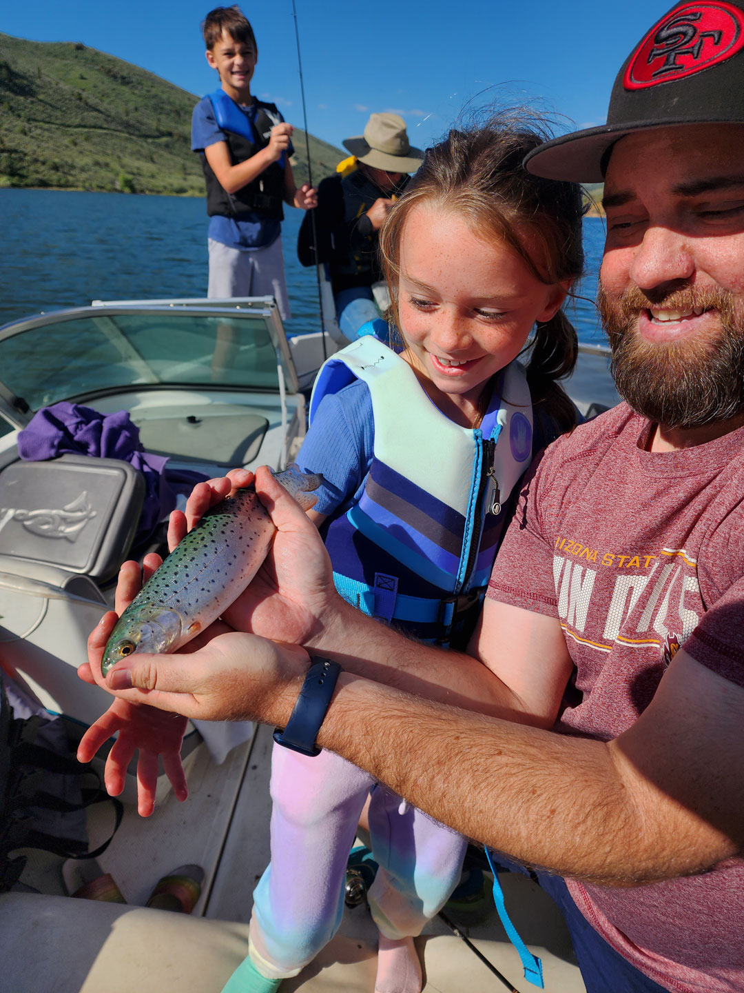 Unusually hot temps during the past couple of weeks have brought on summer-like conditions a little ahead of schedule. We saw fish on the graph and managed to catch a few but not as many as we expected. The surface water temp was 68F and fish were mostly deep and not particularly aggressive. We caught 10-14 inch rainbows and cutts. DWR has also stocked tiger trout and kokanee in the reservoir and has established a slot limit to try to protect fish so they can grow bigger. Under that regulation, all trout 15-22 inches must be released. We should soon see positive results and this may become a more productive fishery.