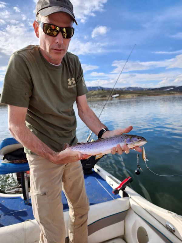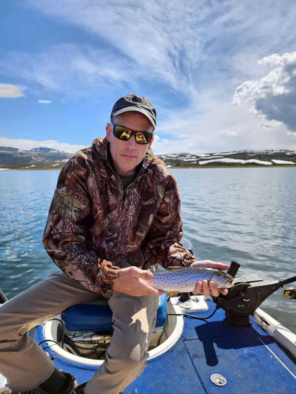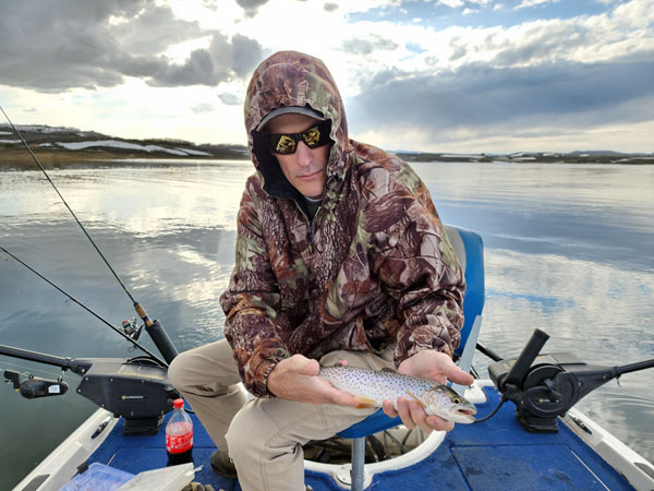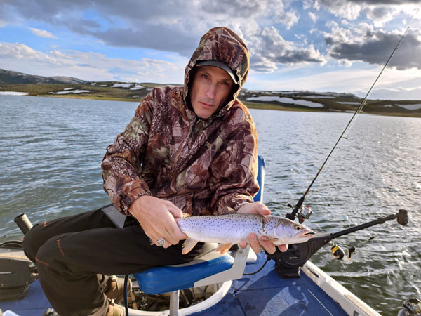 We trolled, pulled into bays and cast lures, and caught fish both ways. In general, we caught smaller rainbows toward the back of bays and nice cutthroat out in open water. Many different lures worked but the most productive was a Lil Jakes, gold with red spots.