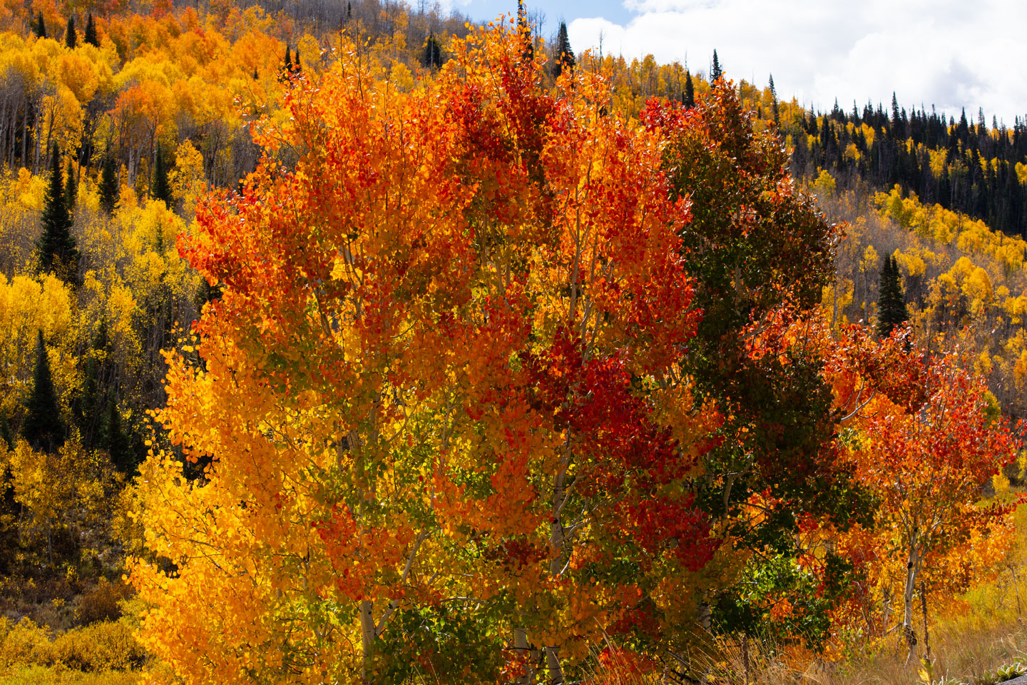 We drove up the Sheep Creek Road from Spanish Fork Canyon. At lower elevations, colors were muted. As we approached the tops of the mountains, the hues became intense. That drive is wonderful at this time of year. The road was dry, and it was easy to pull a boat over the high passes. (That will change over the next weeks. Storms can drop snow on that road at any time. It will close for the winter in late October or early November.)