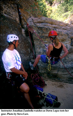 Our instructor is 30-year-old Jonathon Zambella. A native of New Jersey, Jonathon fell in love with Zion National Park on his first visit in February, 1996. Just three months later he and his partner Rick Praetzel moved to Springdale and established the Zion Adventure Company, which specializes in rock climbing and canyoneering classes, as well as outfitting trips through the Zion narrows. Besides myself there are three other students in Jonathon's class today. Candy Rugg, a 30 year-old nurse from Louisiana who has recently re-located to Salt Lake City, Rudy Aguila, 30; and Dawn Lopez, 23, both school teachers from California.