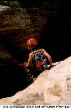 We are in a canyon south of Zion National Park. We have just spent an hour hiking up a fairly narrow canyon. We did it by hugging the ledges and goat trails along its sides. We stop to rest in the shade of a slot canyon two shoulder-widths wide. Our instructor will give us some training, after which we'll go back downcanyon, this time right through its center, over its edges, ledges and waterfalls and through its cold pools of standing water.