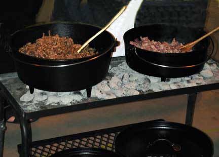 In a 12-inch Dutch oven, brown hamburger. Add onion and pepper and saute until clear. Stir in tomatoes and beans and bring to a boil. Add molasses and garlic. Salt and pepper to taste.