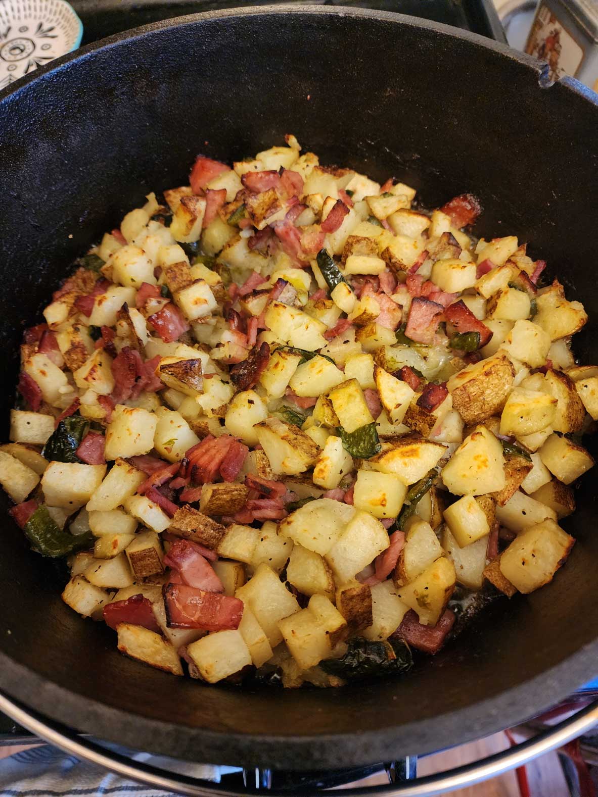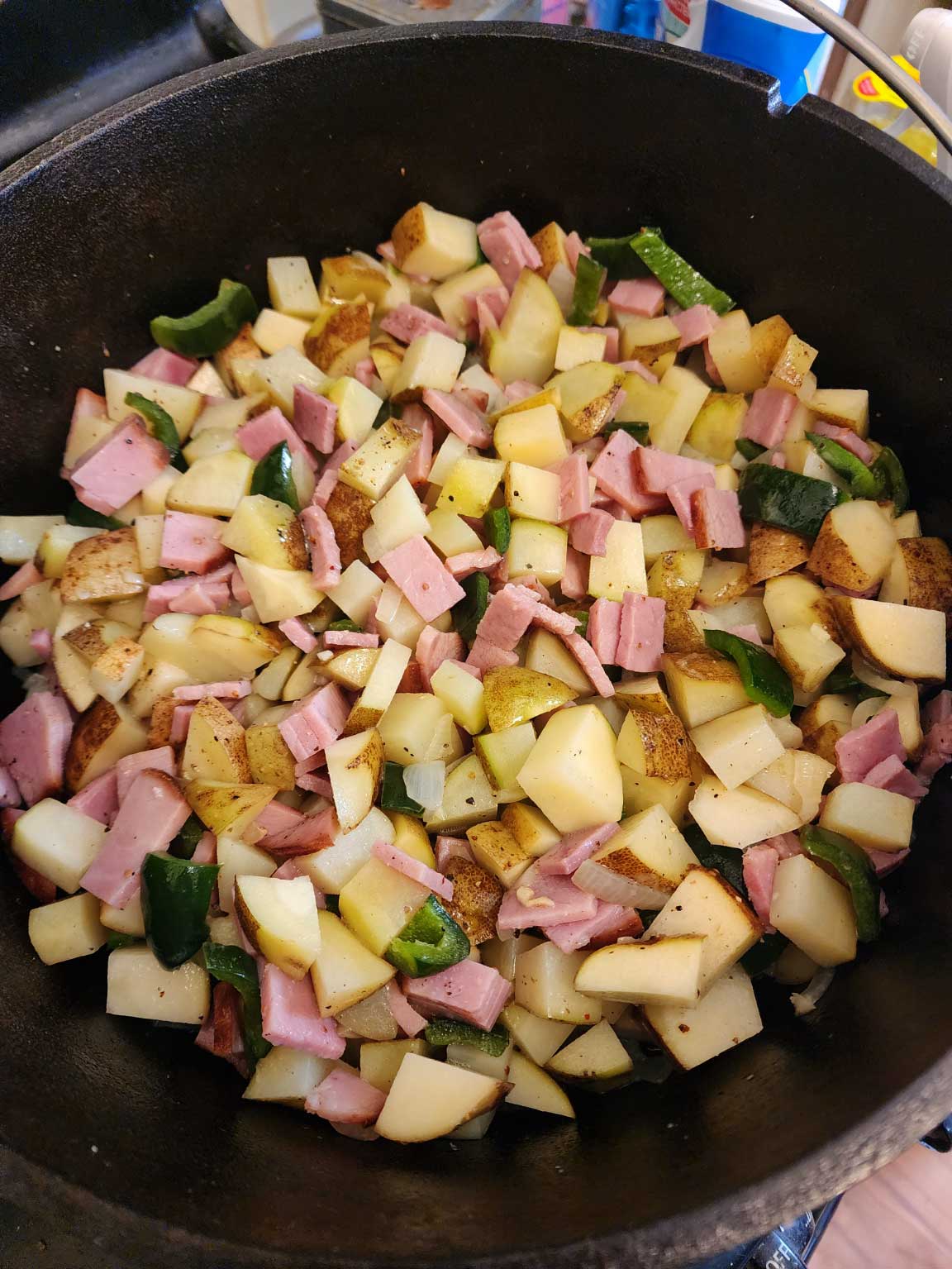 We eat well when we are camping -- particularly when we bring out the old black pots (Dutch ovens). This recipe is for a hearty one-pot meal that is easy and delicious. Potatoes are always a crowd pleaser. I added ham, and it was delicious, but bacon or sausage would also have worked well.