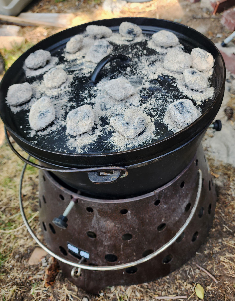 New Dutch oven chefs often underestimate the time needed. It takes a half hour or so for the briquettes to get hot and about an hour to cook the potatoes. If you rush it the quality will suffer.