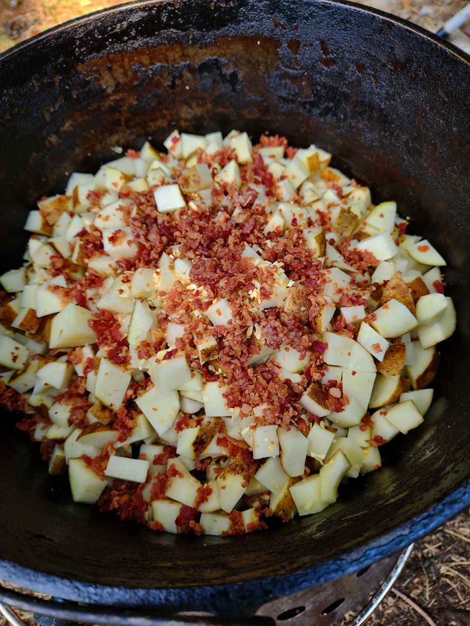 My buddies and I drew the assignment to cook Dutch Oven Potatoes for a group of 120 people. We did and the potatoes turned out great. Mine were the best, of course, because I used my simple recipe for perfect potatoes.