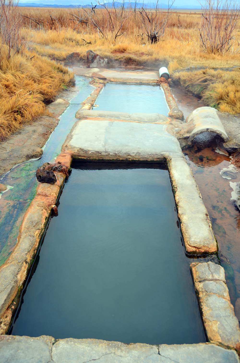 The springs originate in a marshy area and a ditch brings the hot water down into three old concrete tubs. The tubs are not big – two people can soak per tub in comfort. Three or more can fit in if you don't mind being cozy.