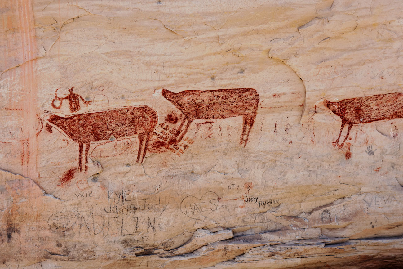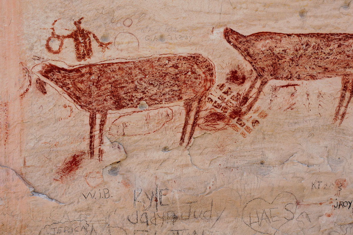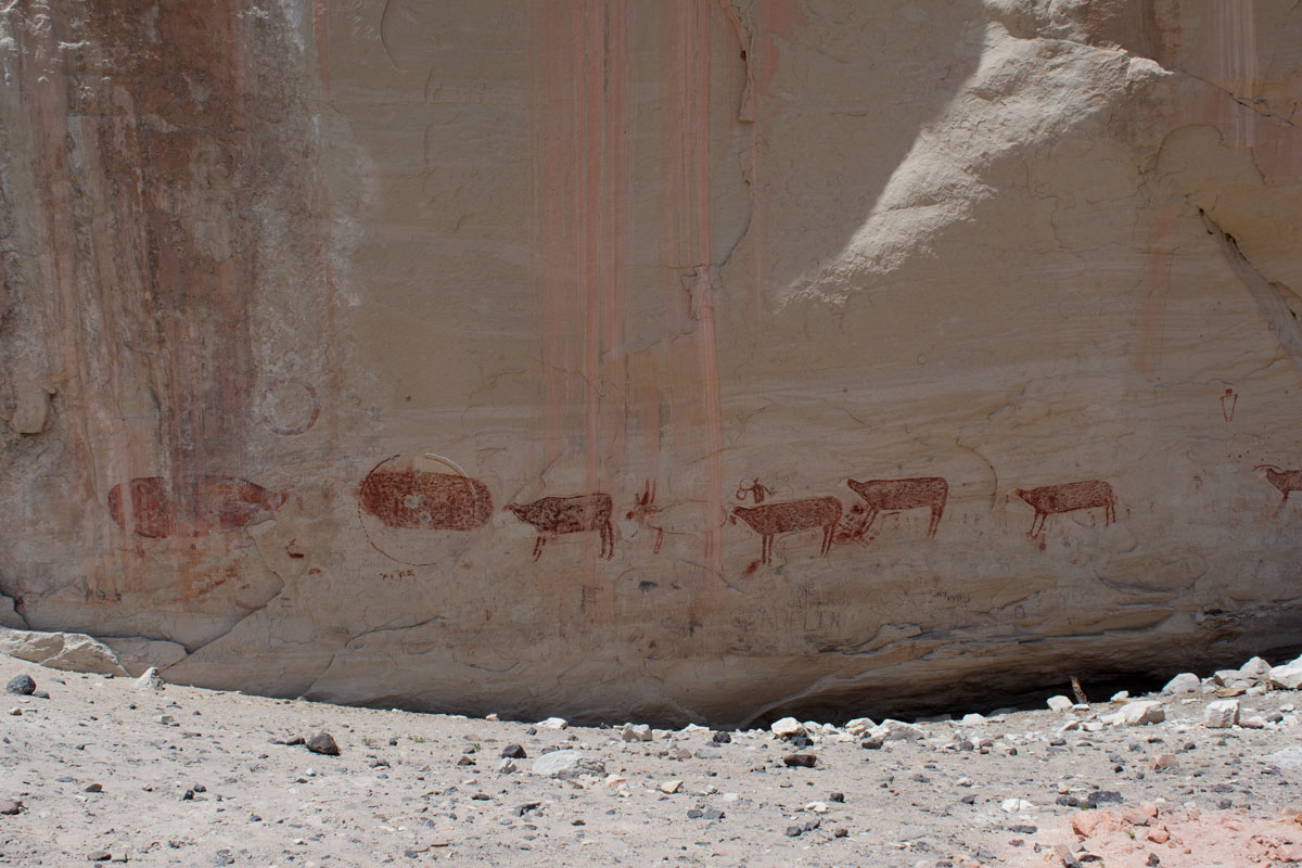 Large, colorful pictographs and smaller, faded/eroded petroglyphs can be viewed in Fish Creek Cove, on the north end of Boulder Mountain. This is one of the most impressive rock art panels in the Capitol Reef area. The pictographs are some of the largest found anywhere.