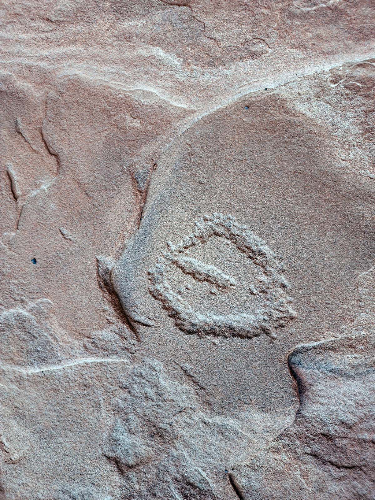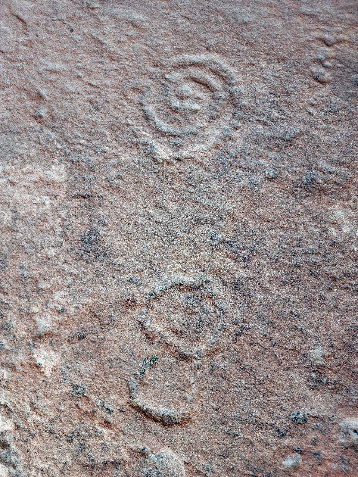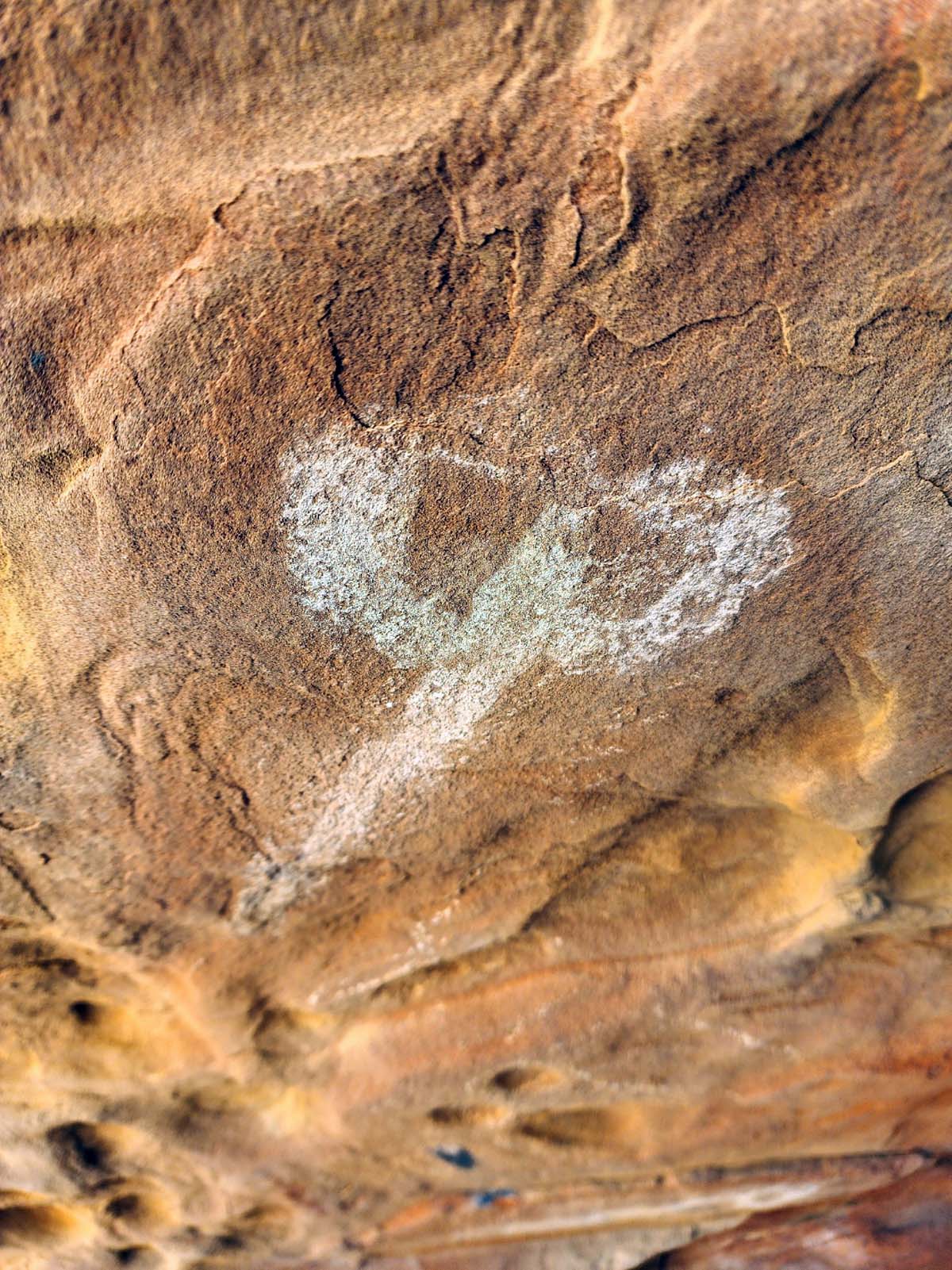 The Naming Cave (also sometimes called the Birthing Cave) contains a large sandstone slab that has fallen at an angle inside the cavern. The top of the slab is covered with very detailed petroglyphs. The second cave only has a few petroglyphs, which are pecked into the floor. There are also a few pictographs painted onto the cave's ceiling. Some are faint and look old. Others look like they are recent and are probably vandalism.