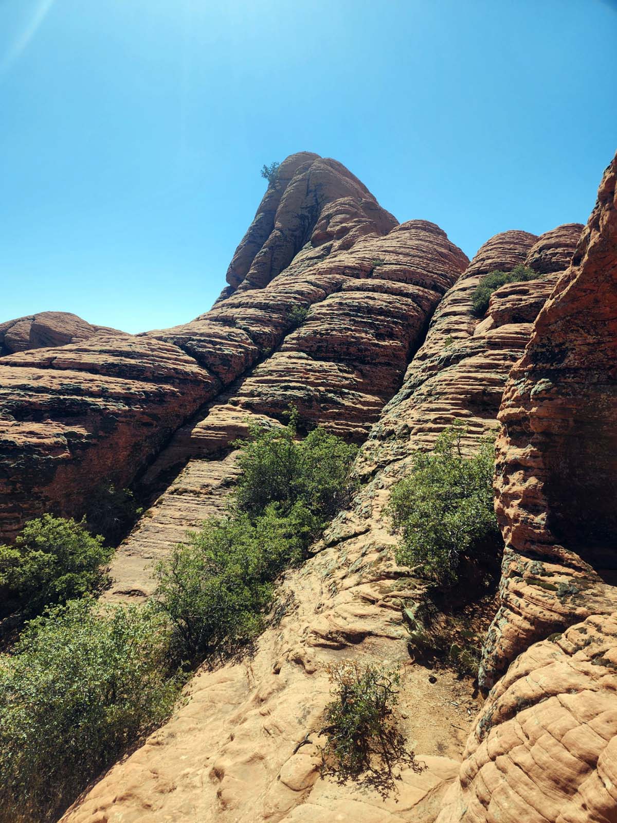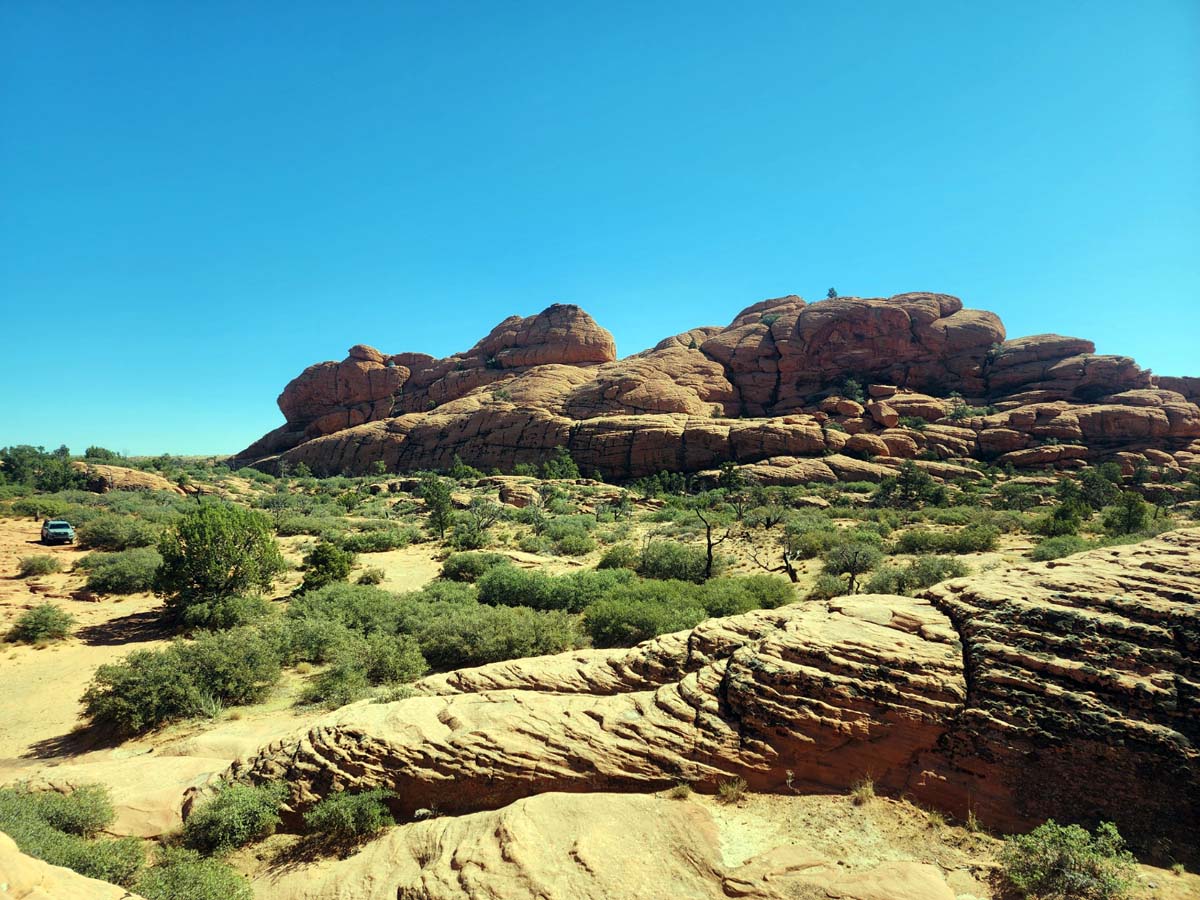 The area is surprisingly beautiful, almost like a park, with green trees and brush flanking red rock fins and towers, growing out of the sand on top of a mountain towering above the surrounding desert.