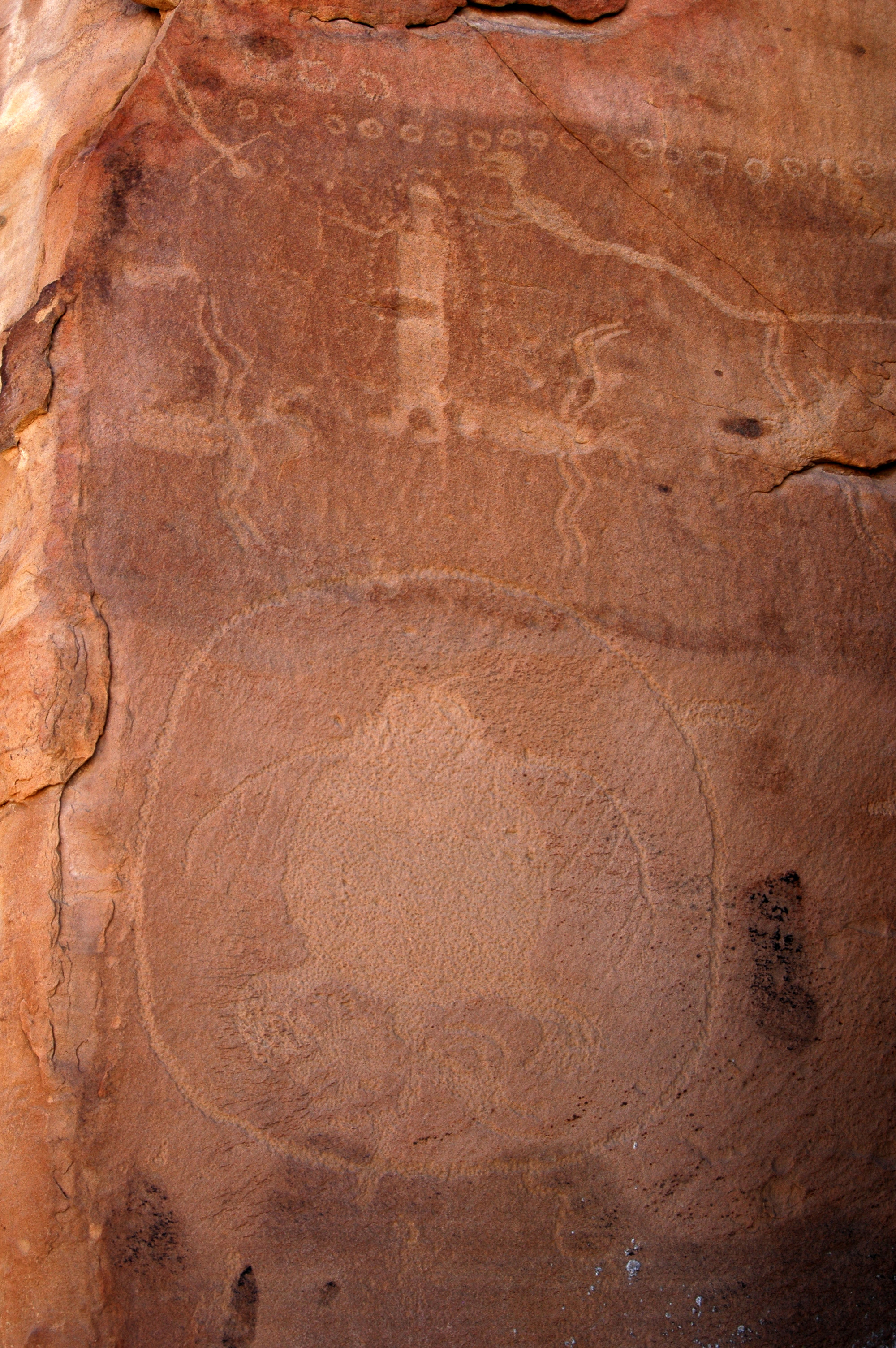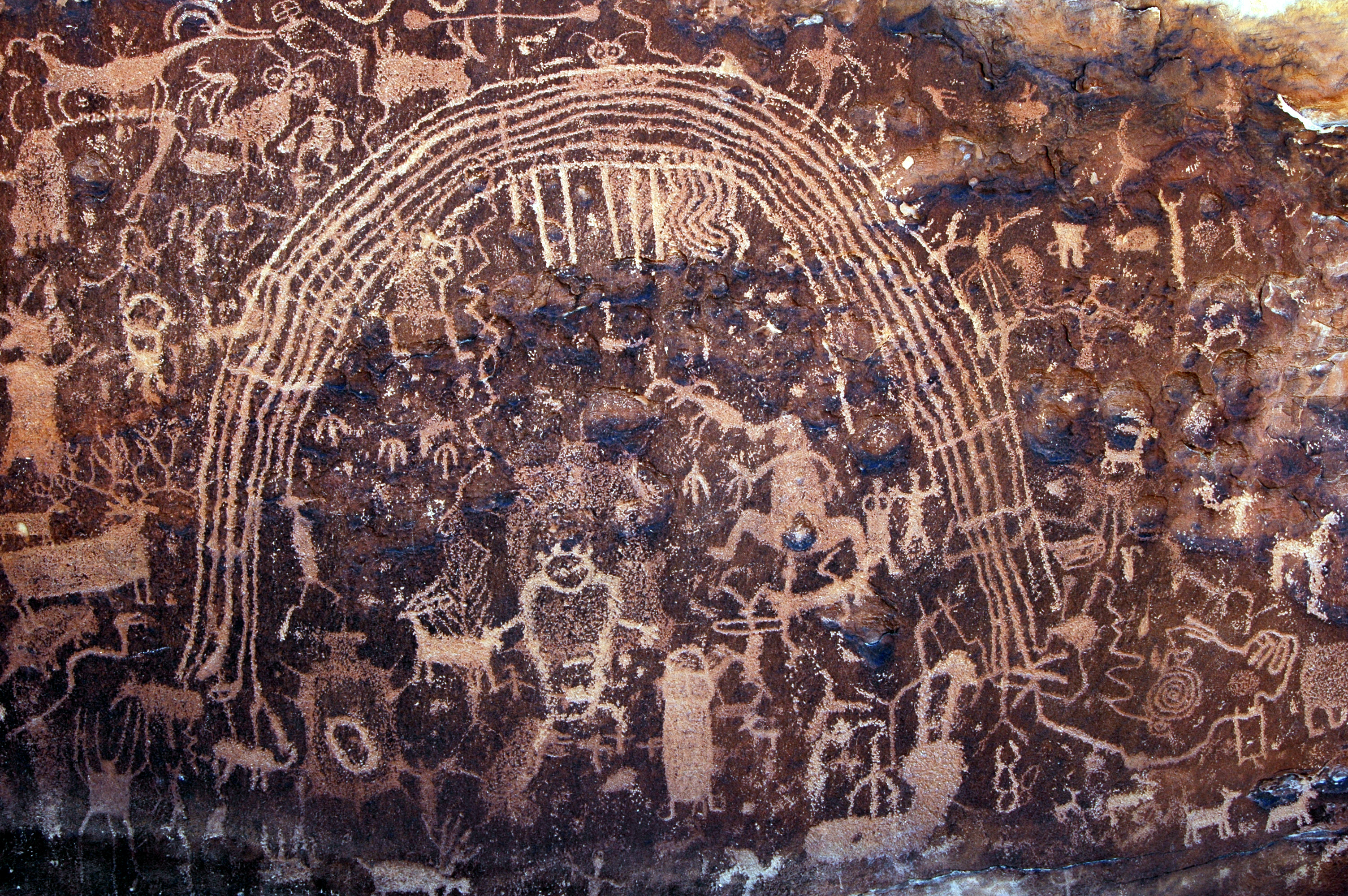 Virtually every inch of one huge rock face is covered with figures. Nearby rocks also have images. An arch or rainbow decorates the main panel. Or is it there to shelter and protect the humanoids, which are surrounded by dragons and wolves and snakes?