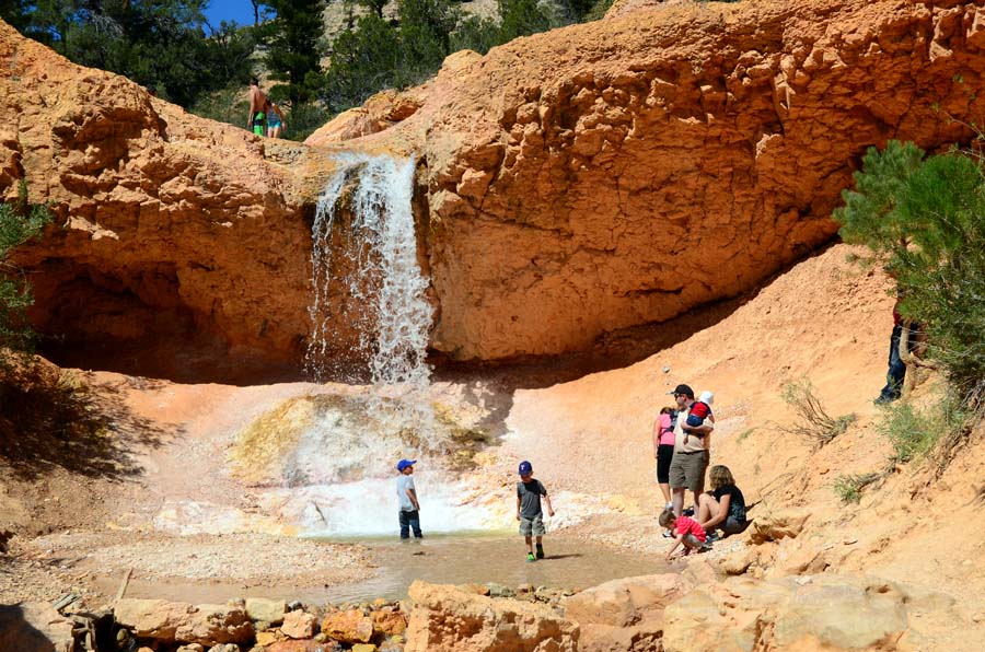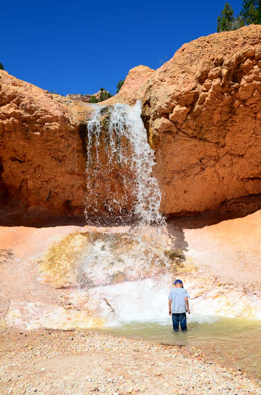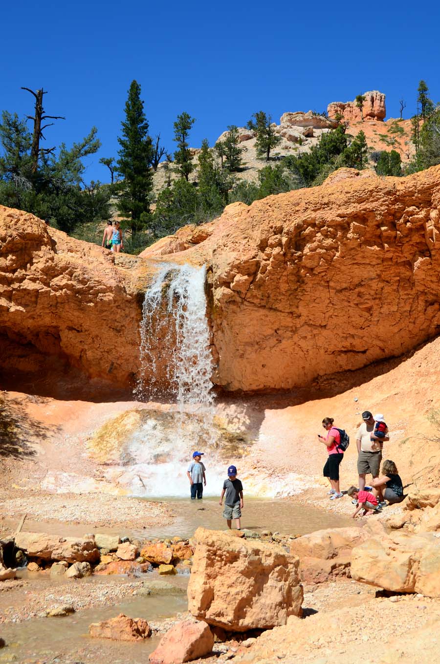 Park at the Mossy Cave trailhead and follow the trail into the canyon. The trail forks after you cross the stream and climb up the hill. The left form goes to Mossy Cave, the right to the top of the waterfall. Both are worth seeing.
