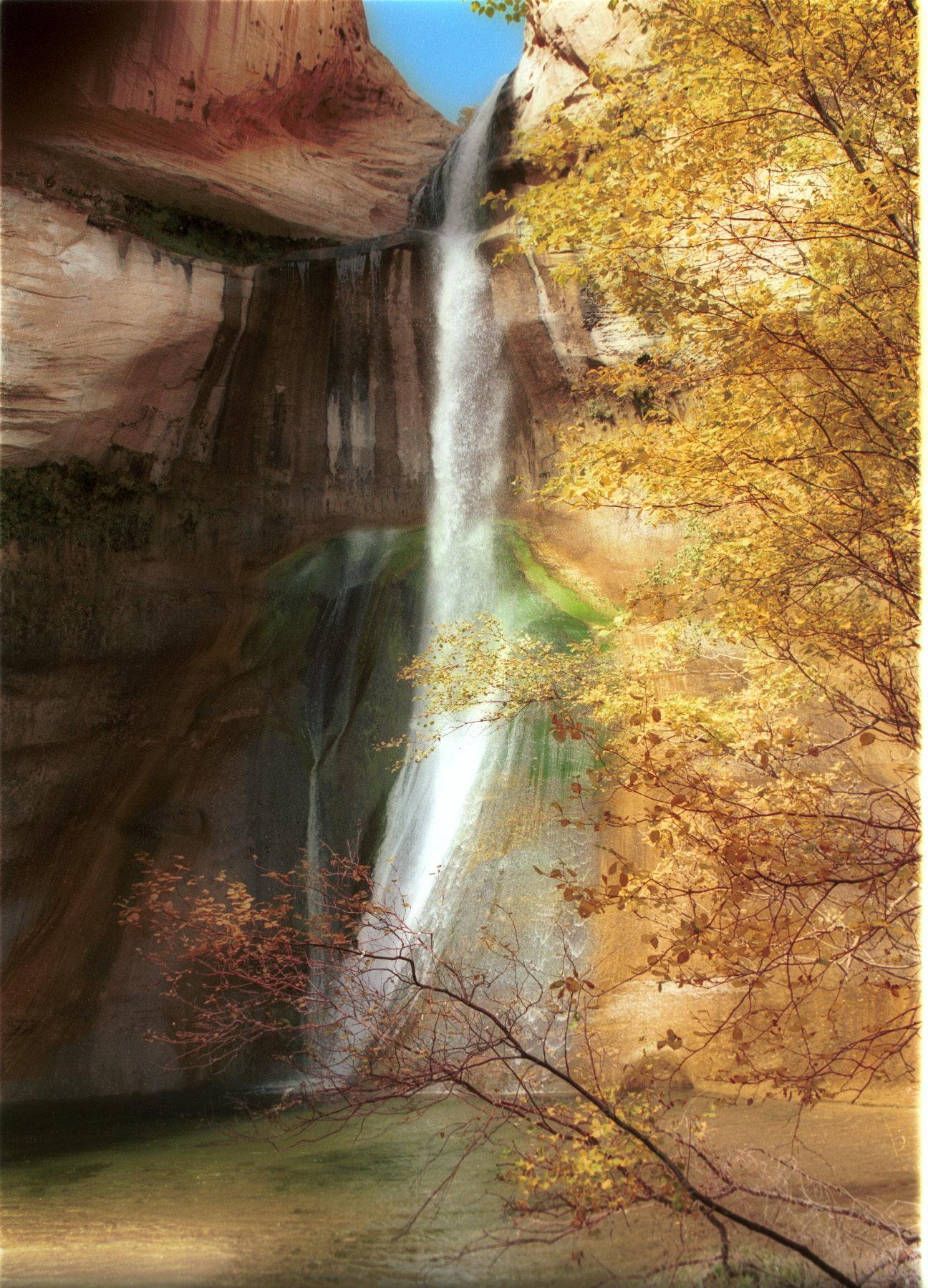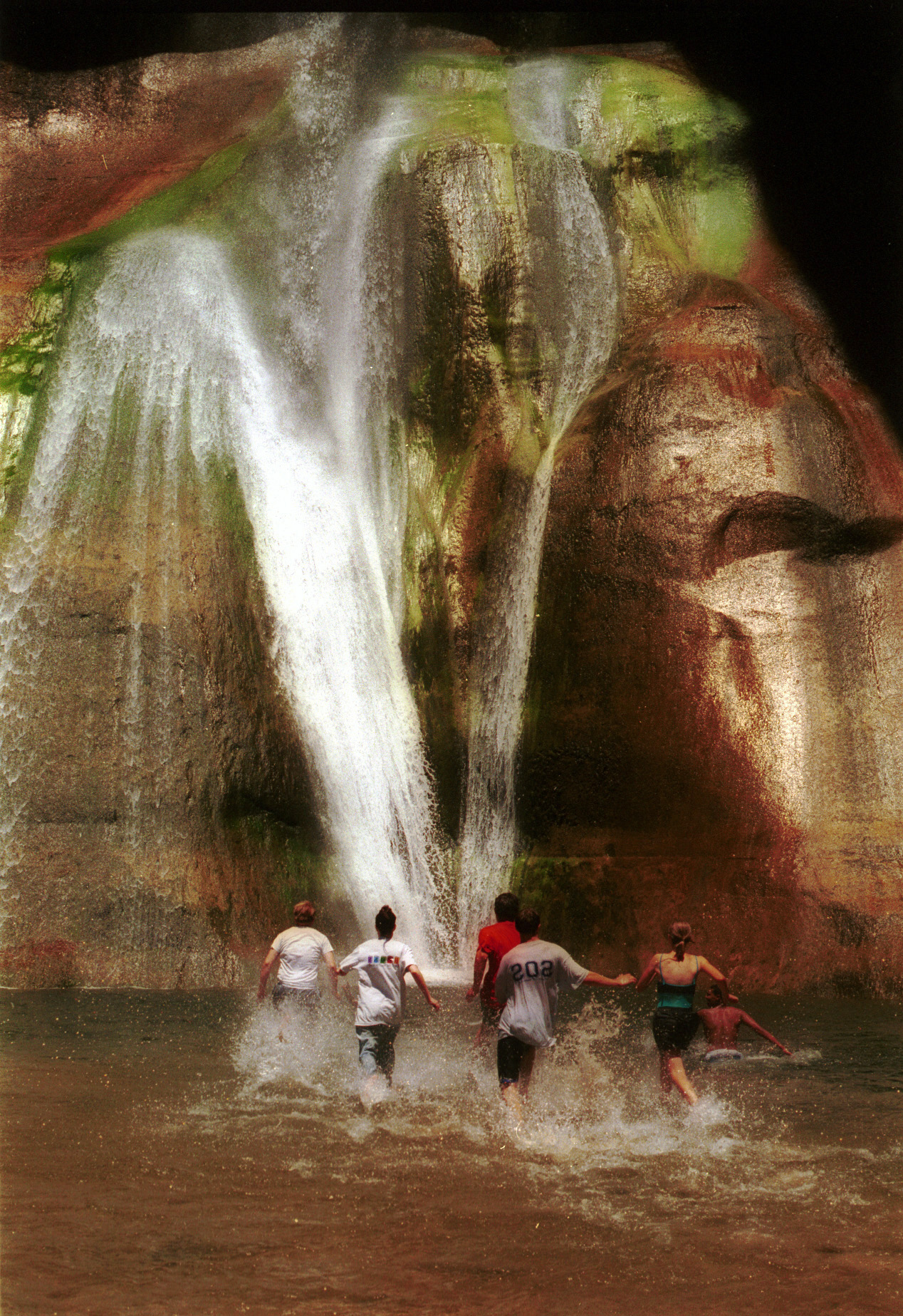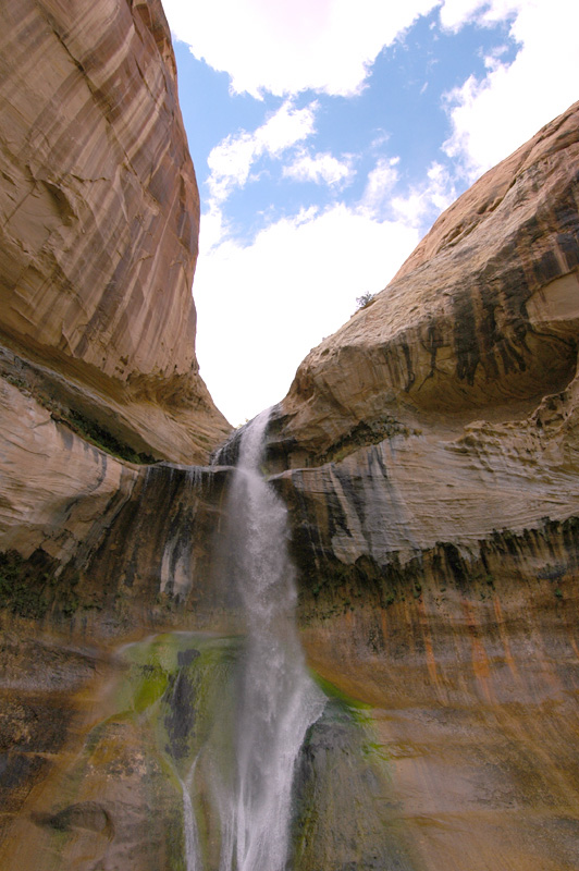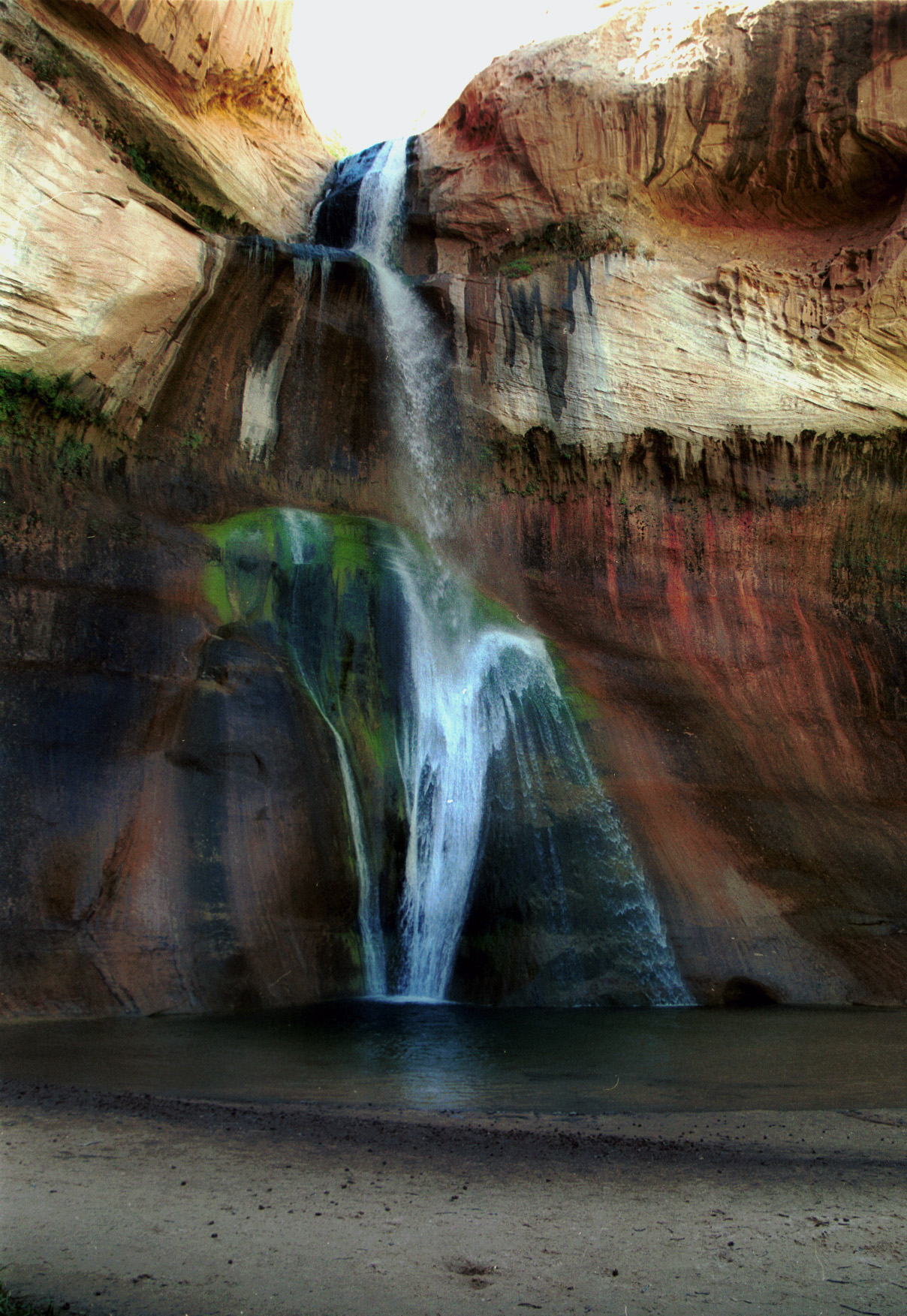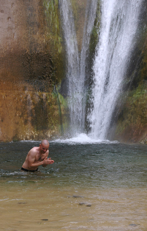 The final approach before the lower falls is exciting. The walls pull together and the stream runs out over a sandstone staircase that is dotted with carved out water-pockets. Small cascades pour into these water-holes, creating invigorating ice-cold Jacuzzis. A final small cascade, a deep pool sometimes full of rippled sand, sometimes dark and fathomless, and then the stream rounds a curve and launches into space. Cautious footsteps bring you to a beautiful and unique view in a beautiful and unique canyon.