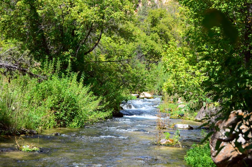 From Jones Hole Federal Fish Hatchery a well-marked trail follows the stream all of the way to its confluence with the Green River. The stream's water is clear and cold and supports a thriving population of brown trout. The waterfall is on a tributary and an obvious sign marks the way.