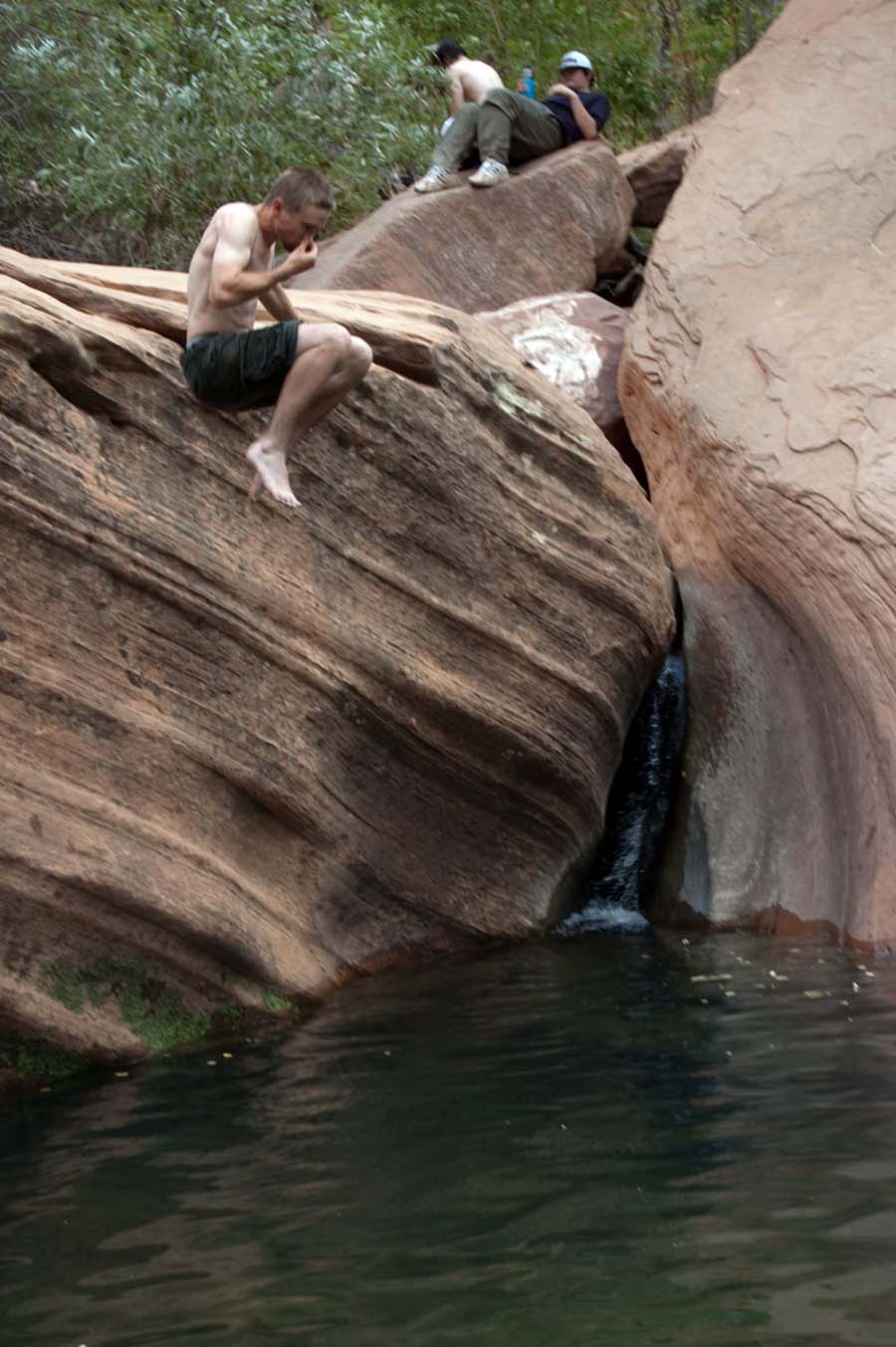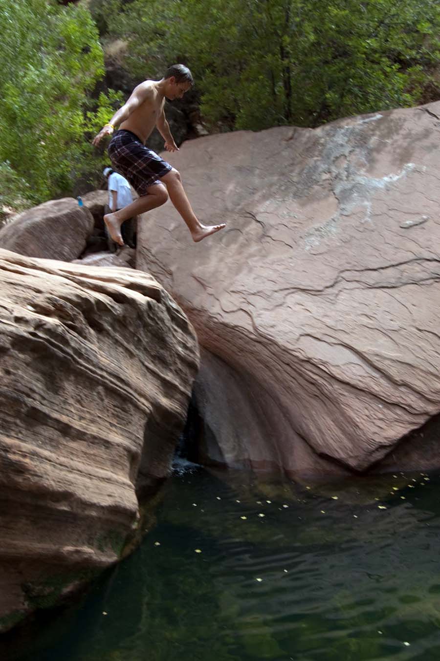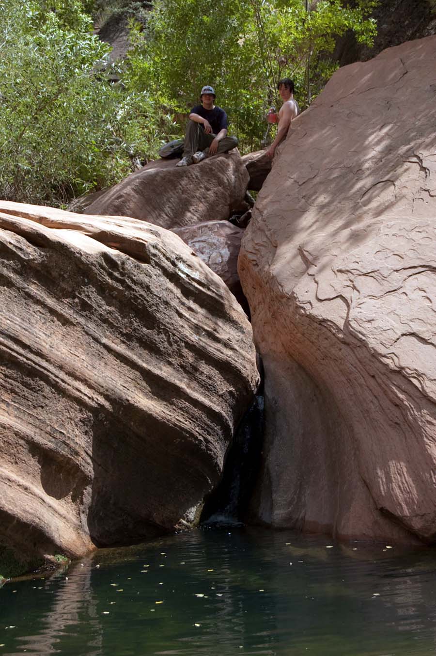 Pine Creek crosses Hwy 9 just below the switchbacks. There is a parking area on the first switchback. Park there and then just hike down into the canyon. The pool is almost directly below the parking area. The water is deep enough that some people jump or dive from the rocks above.